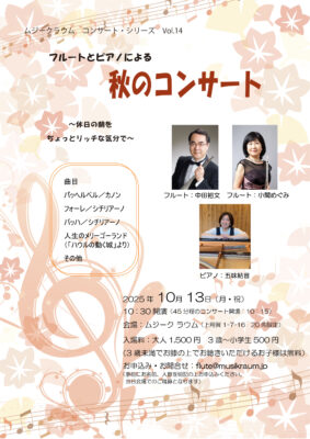 2025年9月17日 秋のコンサート ムジークラウムコンサートシリーズVol.14秋のコンサートコロナ禍などで間が空いてしまいましたが、13回続けてきたマチネーコンサートシリーズの名称を今回より改めました。地域密着型のコンサートです。どなた様もお気軽にお越しください。 投稿ナビゲーション Previous PostNext Post