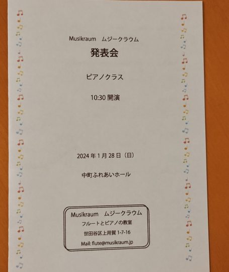 2024年1月29日 発表会を終えて ピアノクラスの発表会 1/28(日)はお教室で3回目のピアノクラスの発表会でした。 幼稚園生から小学生の14人、目標を持って一人一人が、一生懸命に練習を重ねて進んできました。 スポットライトを浴びたステージ上で、グランド … Continue reading 発表会を終えて ピアノクラスの発表会 1/28(日)はお教室で3回目のピアノクラスの発表会でした。 幼稚園生から小学生の14人、目標を持って一人一人が、一生懸命に練習を重ねて進んできました。 スポットライトを浴びたステージ上で、グランド … Continue reading ... Read More